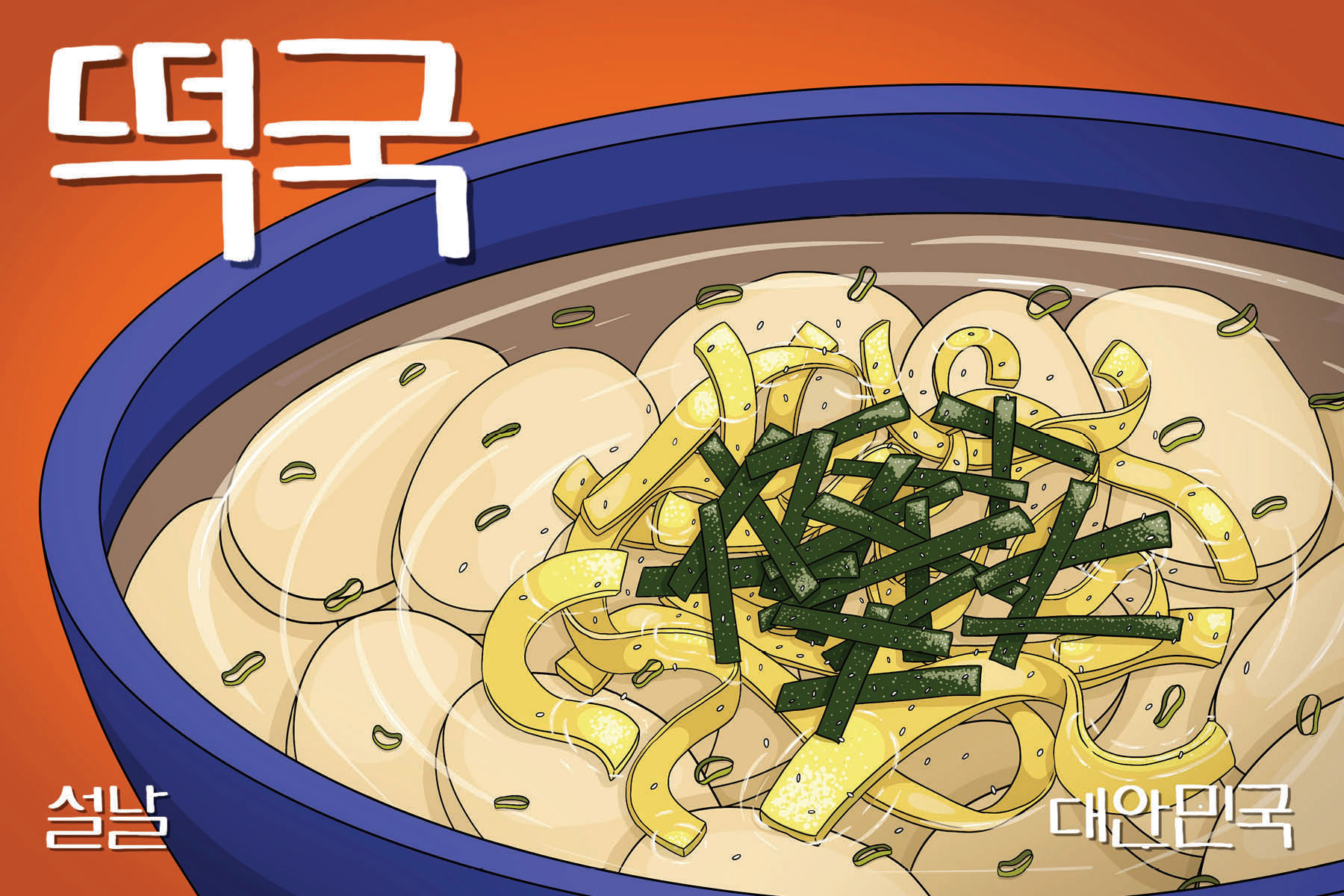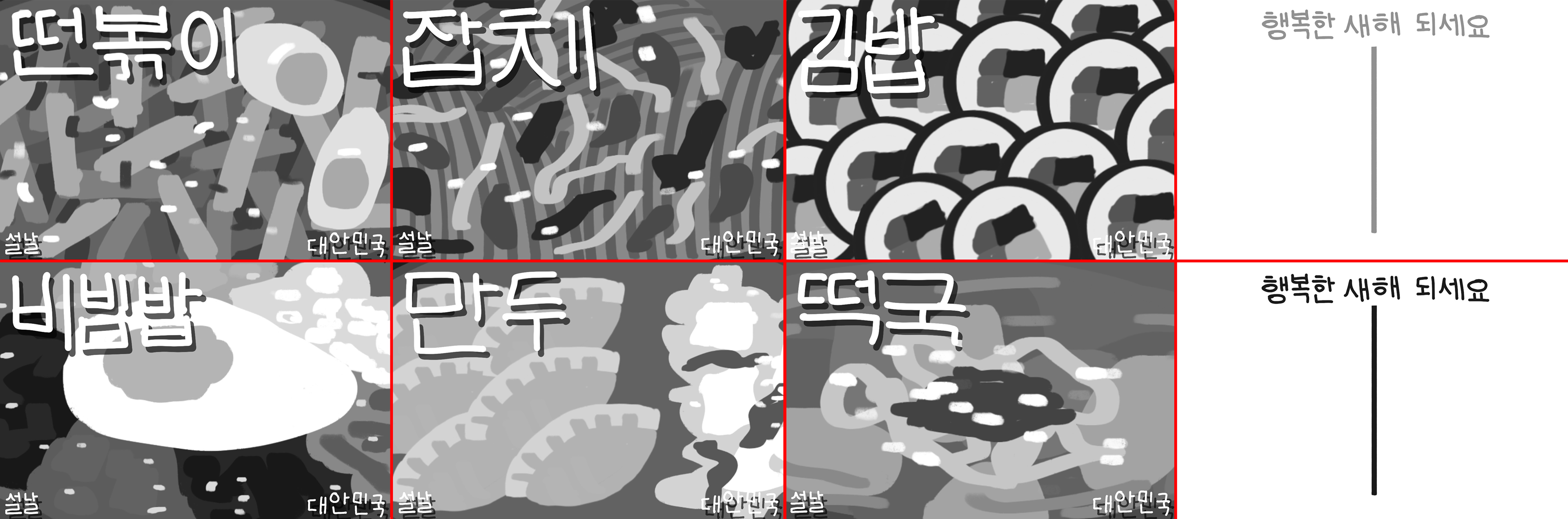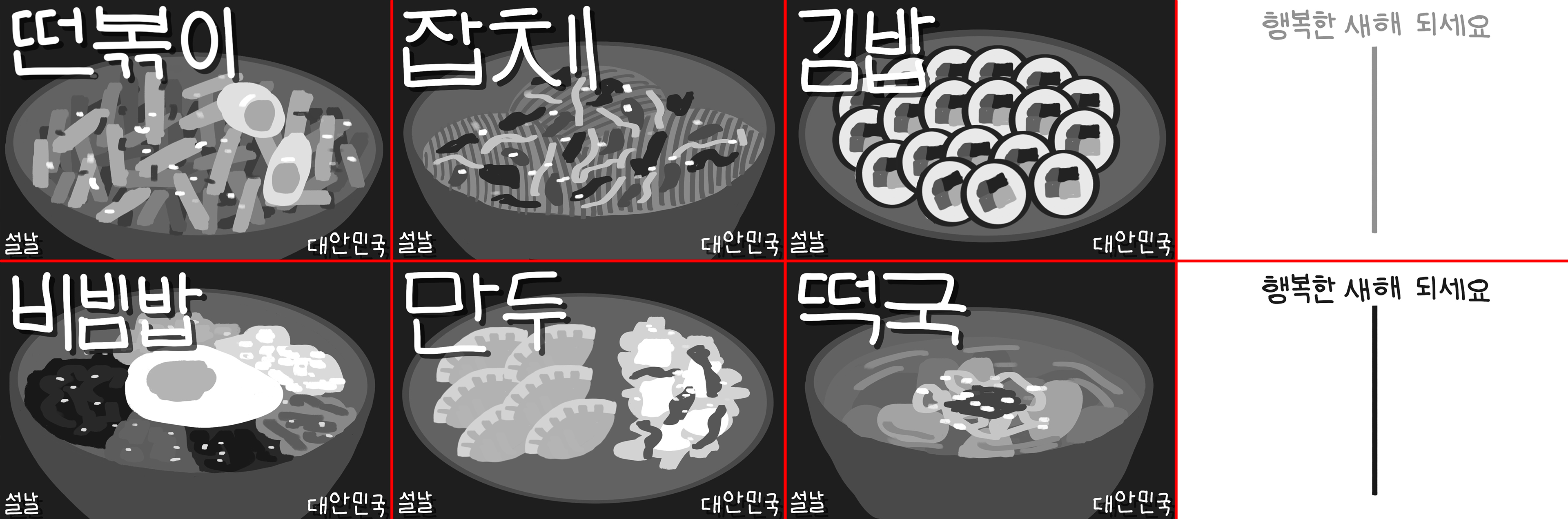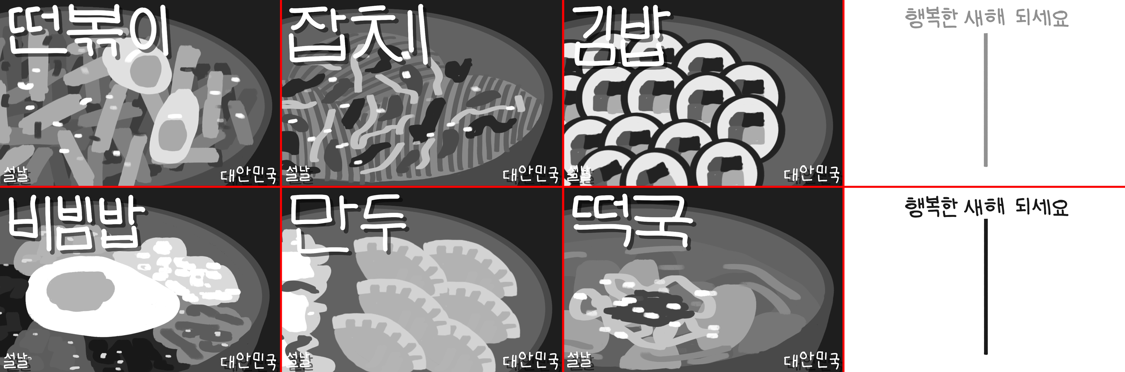 6 illustrated post cards depicting popular dishes in South Korea as a celebration of Korean New Year (Seollal)