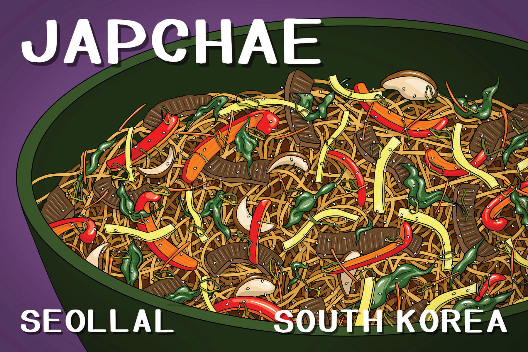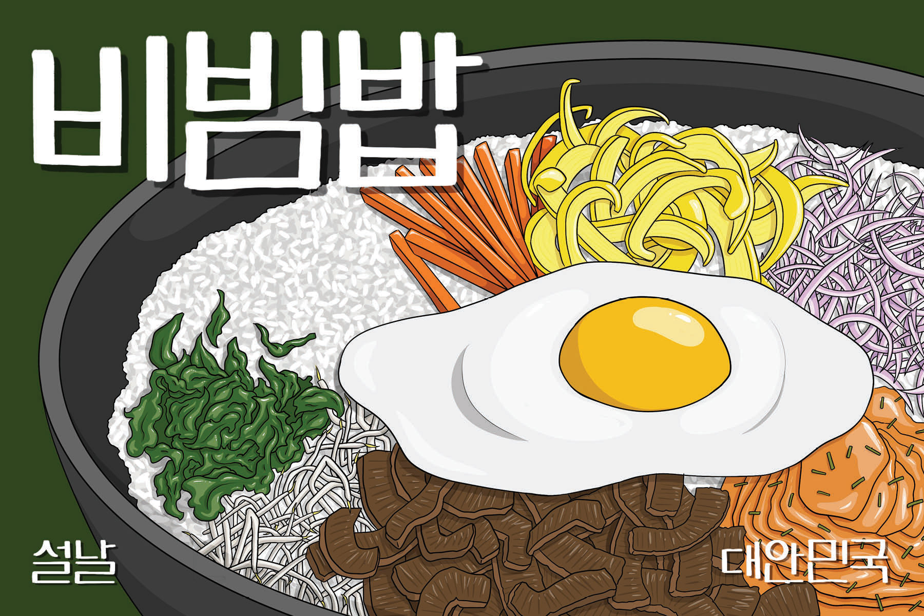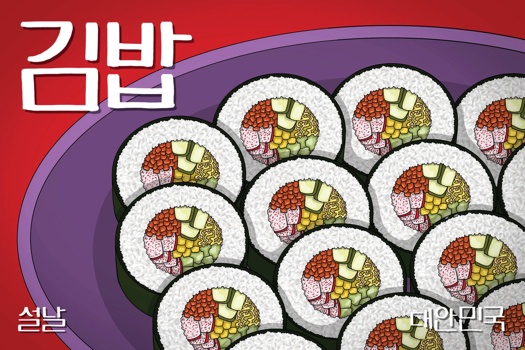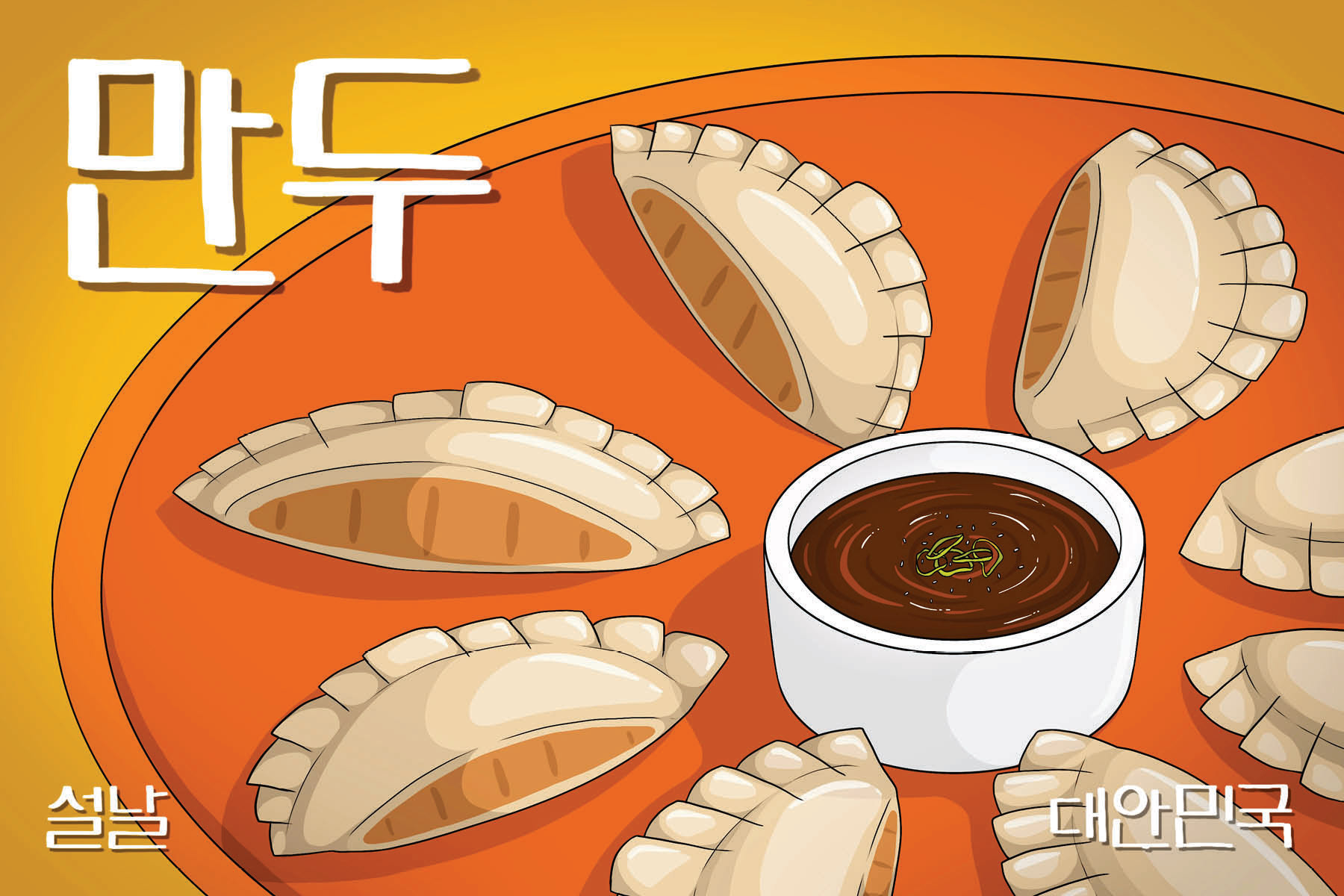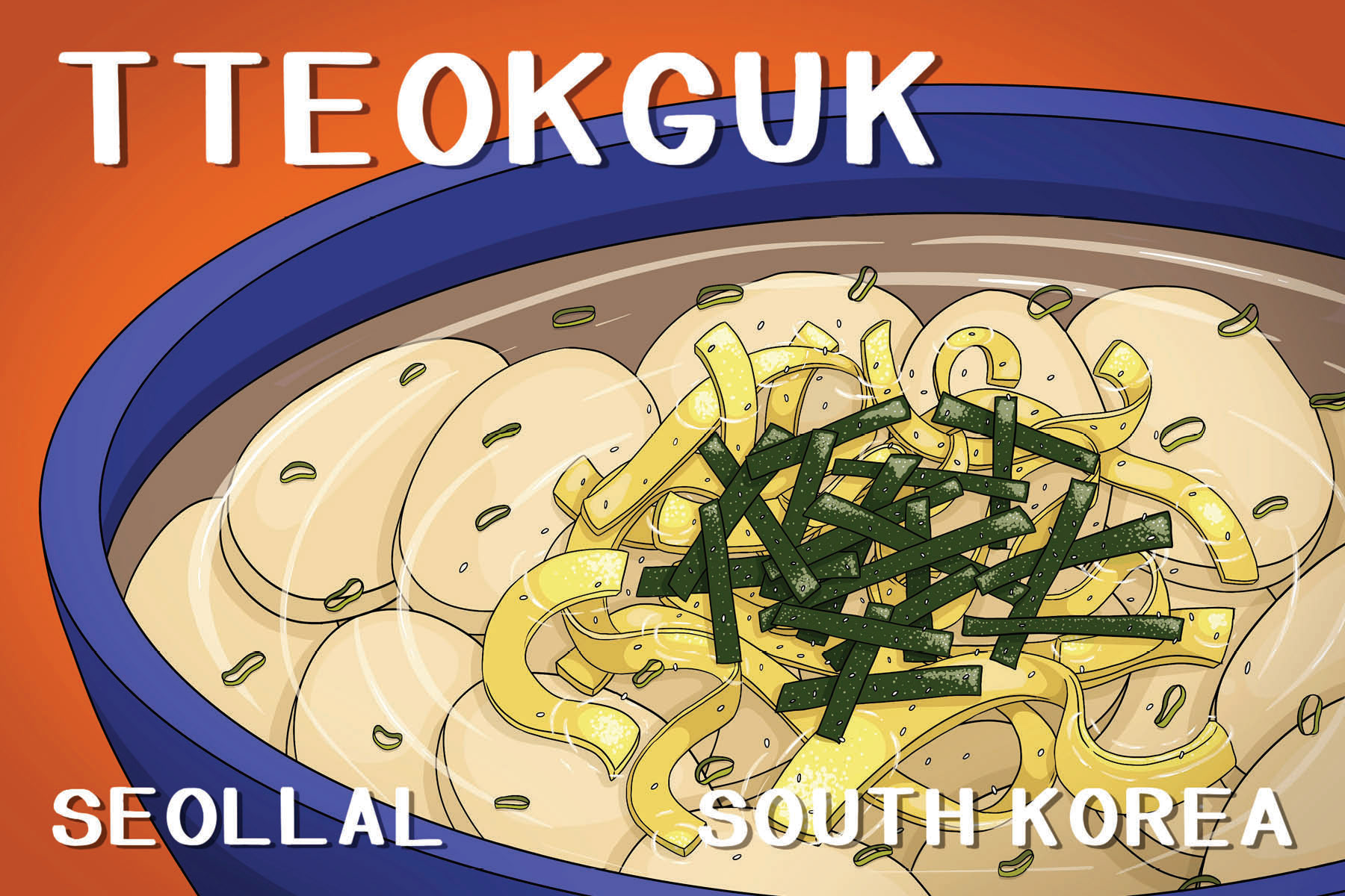 6 illustrated post cards depicting popular dishes in South Korea as a celebration of Korean New Year (Seollal)