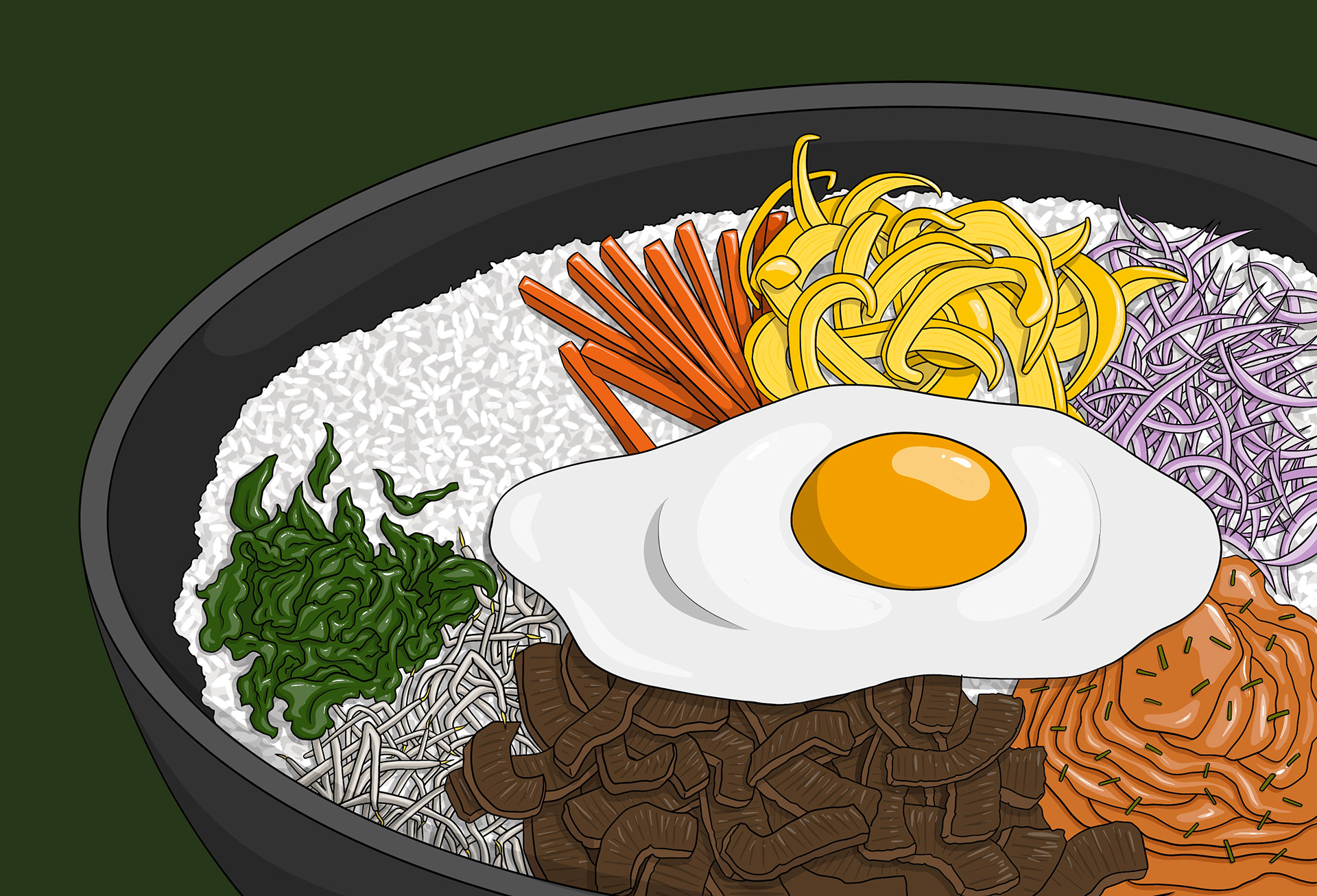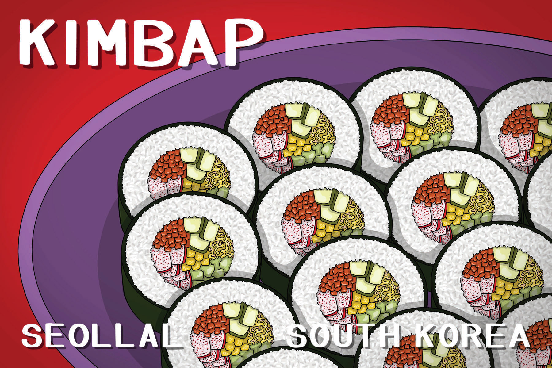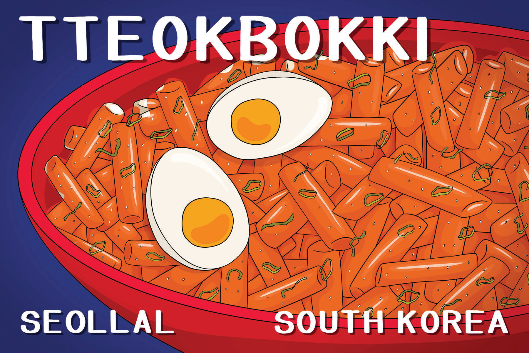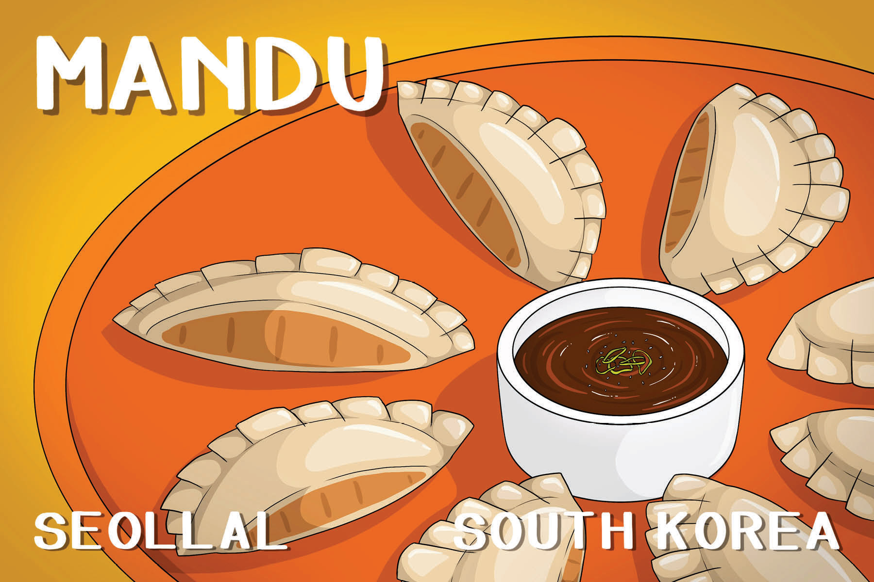 6 illustrated post cards depicting popular dishes in South Korea as a celebration of Korean New Year (Seollal)