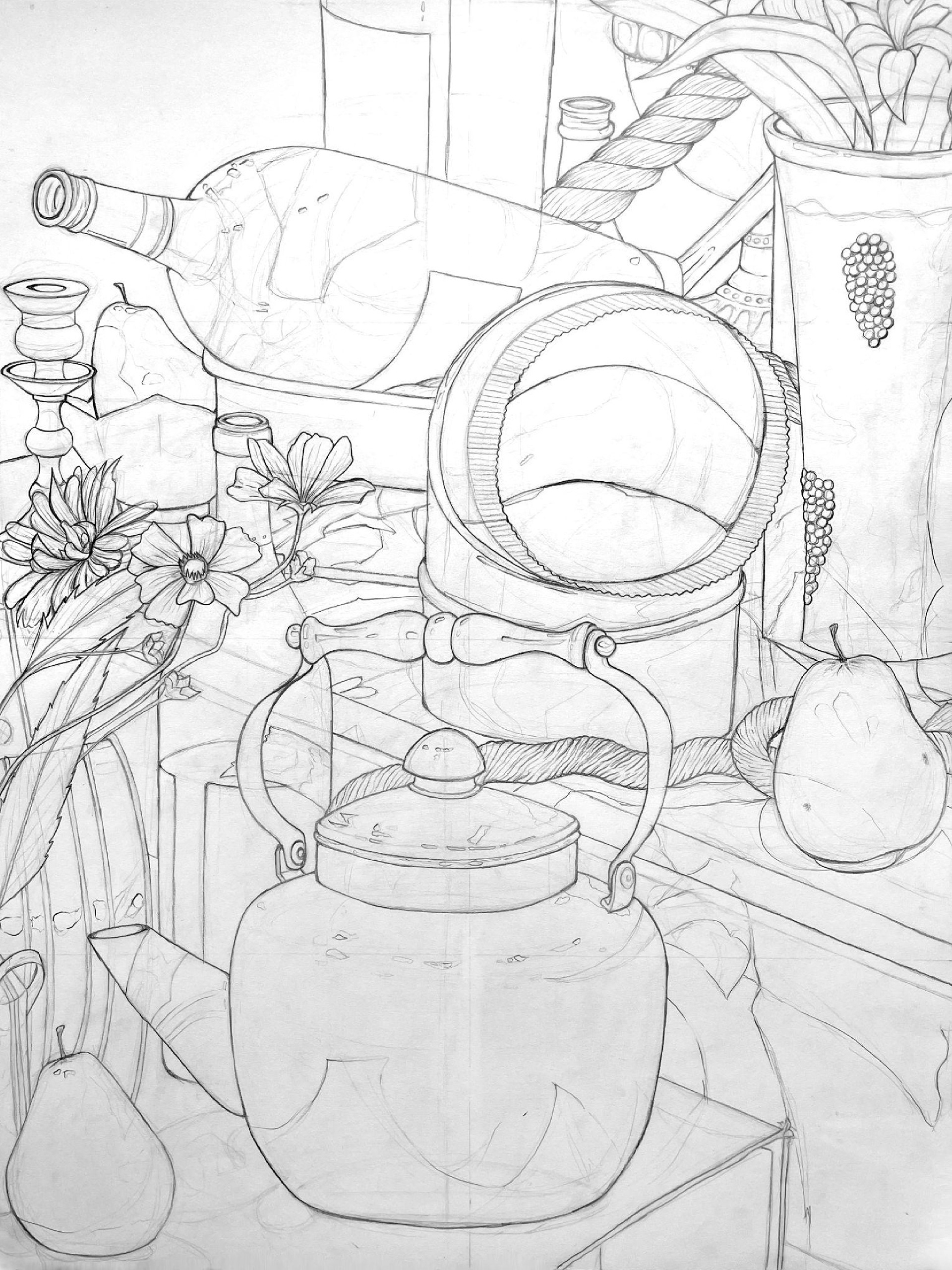 Illustration of a still life focusing on cylindrical forms, perspective with foreshortening, and experimenting with stroke weight in graphite.